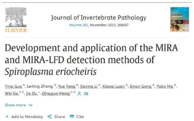 南京師范大學(xué)海洋科學(xué)與工程學(xué)院孟慶國(guó)課題組研究了MIRA 和 MIRA-LFD 螺原體檢測(cè)方法的開(kāi)發(fā)和應(yīng)用。相關(guān)研究成果以“Development and application of the MIRA and MIRA-LFD detection methods of Spiroplasma eriocheiris”為題在國(guó)際學(xué)術(shù)期刊journal of invertebrate pathology在線發(fā)表,期刊影響因子為3.4。