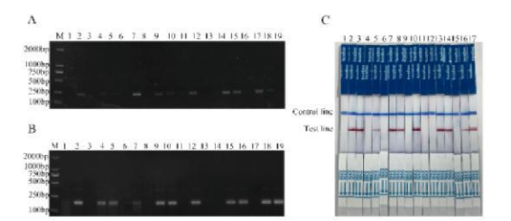 最后使用優(yōu)化過(guò)的MIRA和MIRA-LFD 反應(yīng)體系、反應(yīng)引物、反應(yīng)條件,針對(duì)隨機(jī)提取的17個(gè)樣本DNA以及陽(yáng)性對(duì)照與陰性對(duì)照分別進(jìn)行了中華絨螯蟹螺原體MIRA,MIRA-LFD和PCR檢測(cè). 通過(guò)分析比對(duì)不同檢測(cè)方法的結(jié)果,判斷本實(shí)驗(yàn)所建立的中華絨螯蟹螺原體MIRA和MIRA-LFD檢測(cè)方法可行。
