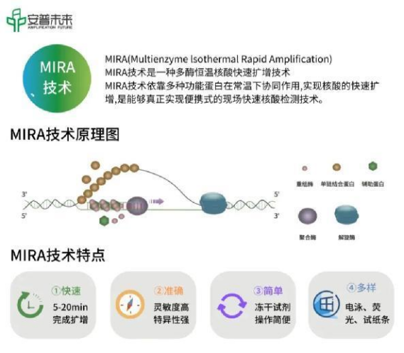 安普未來多酶恒溫快速核酸擴增技術MIRA技術在恒溫39°C-42°C下核酸擴增,反應時間僅為5-20 min。此外,不需要嚴格的實驗室條件,應用場景多元化:綜合醫(yī)院檢驗科、基層醫(yī)療、居家檢測、田間地頭等。
