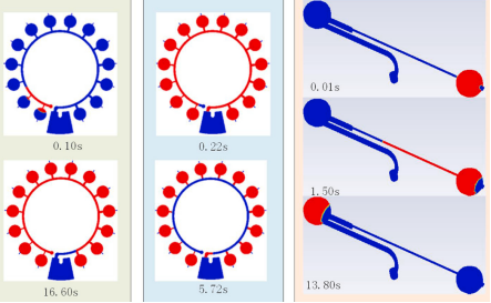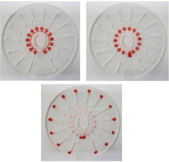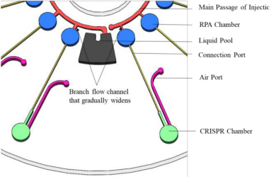 如圖 3,彎曲流道與 RPA 腔之間的短流道逐漸加寬,以減少前后腔連接流道之間的流動阻力。同時,每個 RPA 腔與 CRISPR 檢測腔之間的流道都是疏水的。