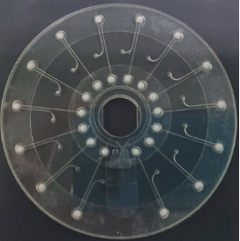 如圖 1,直徑 80 mm 的芯片由 CNC 雕刻而成。該芯片含有 14 個獨立的檢測單元,一次可完成 14 個靶標檢測。